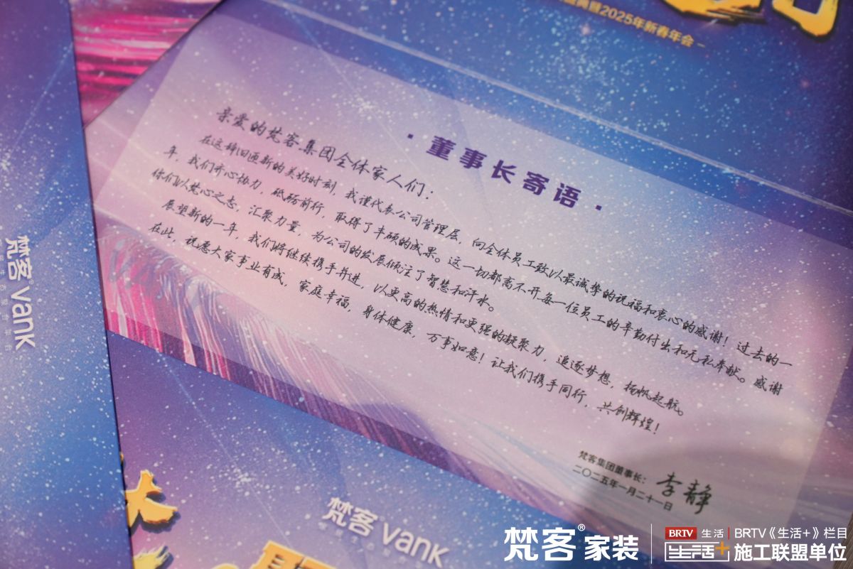 其中還有一封來自梵客集團董事長李靜先生的書信寄語:“過去的一年,我們齊心協力、砥礪前行,取得了豐碩的成果。這一切都離不開每位員工的辛勤付出和無私奉獻。感謝你們以梵心之誌彙聚力量...展望新的一年,我們將繼續攜手並進,以更高的熱情和更強的凝聚力追逐夢想,揚帆起航…”