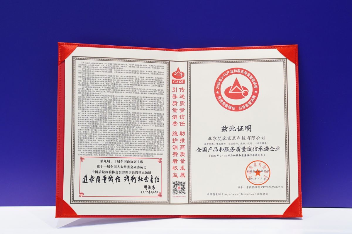 梵客家裝被中國質量檢驗協會授榮譽證書,獲《全國產品和服務質量誠信承諾企業》及《全國質量檢驗穩定合格產品》