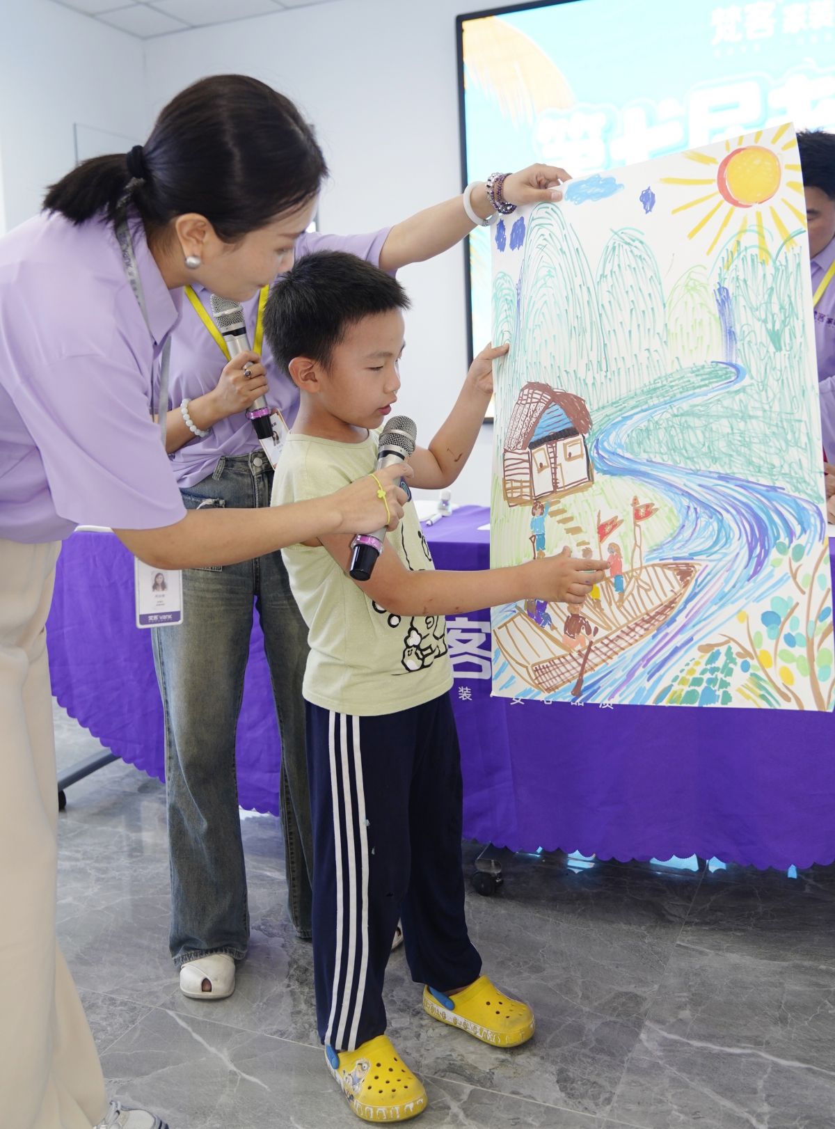 隨後,小朋友向大家講述了自己的繪畫思路,“我畫的是軍艦,可以保家衛國...我希望它能帶我去看這個世界…我想和爸爸媽媽一起去釣魚…我的船順著小溪穿越森林,周圍的風景一定很美…”
