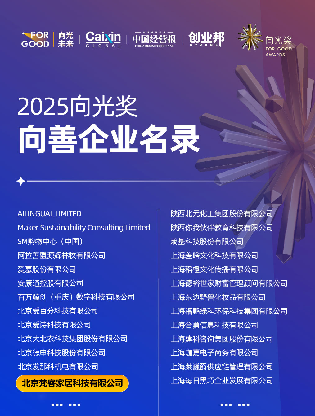 梵客家裝喜訊不斷,近日又斬獲一項殊榮——入圍“2025向光獎-向善企業名錄”!
