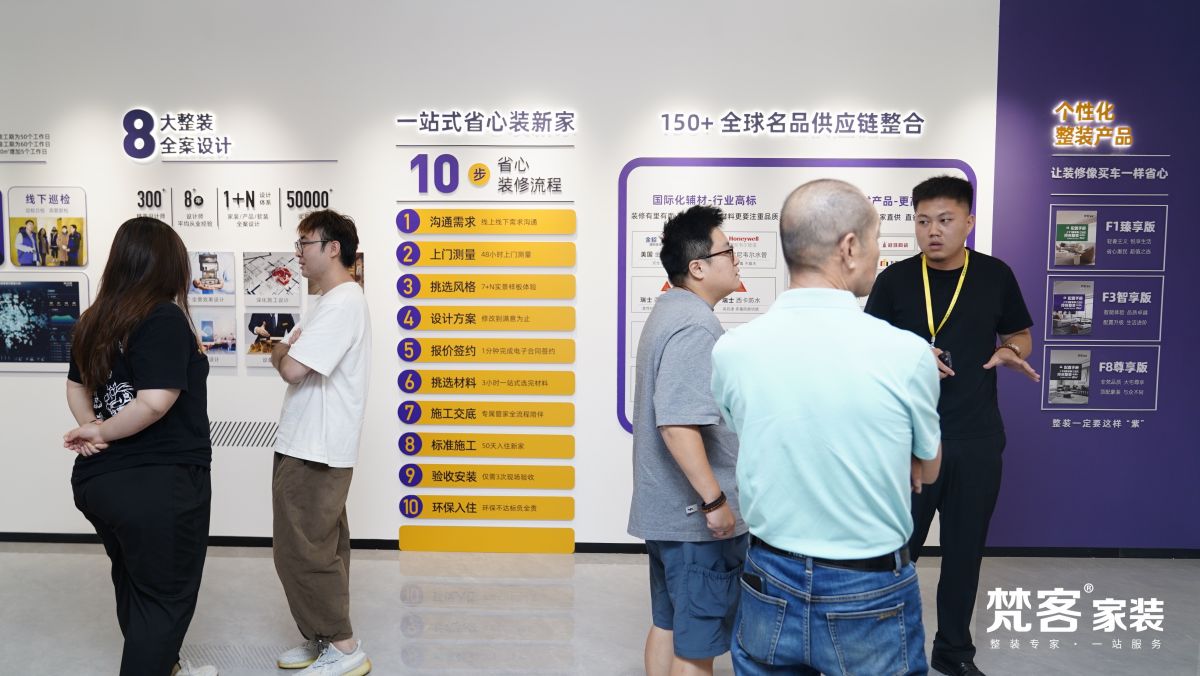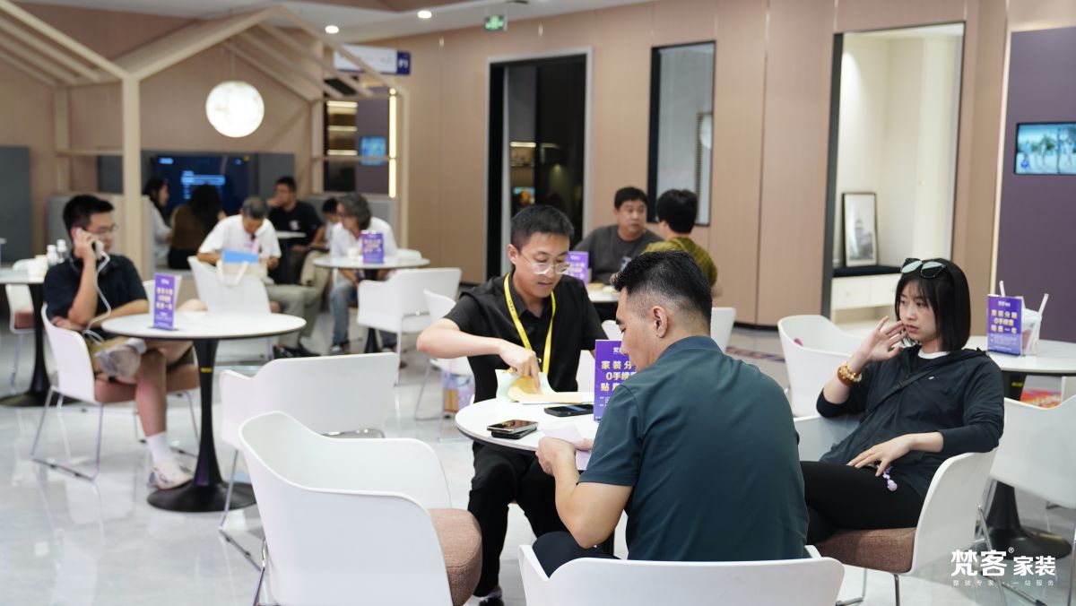 城外誠店采用更新穎的展館設計理念,共三層,設有品牌館、工藝工法區、七宅一生實景樣板間、選材區、軟裝家具展區、洽談區等場景,戰略合作150餘家建材品牌,為用戶提供更豐富的選擇,不用東奔西跑,就可實現一站式整裝解決方案。輕鬆舒適的環境、整齊劃一的動線、琳琅滿目的產品、匠心獨具的工藝…讓逛家裝展廳成為一種享受,也讓來梵客的業主朋友體會到賓至如歸的感覺。