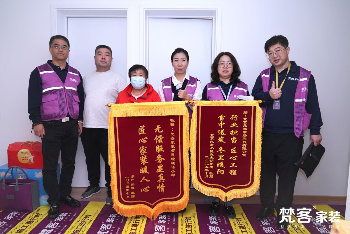 業主今天也來到現場,送上錦旗以表對梵客家裝的感謝,紅底金字的“雪中送炭”、“無償服務”耀眼奪目,更堅定了梵客家裝做好服務的決心。巡檢小組也為業主送上伴手禮,感謝信賴。