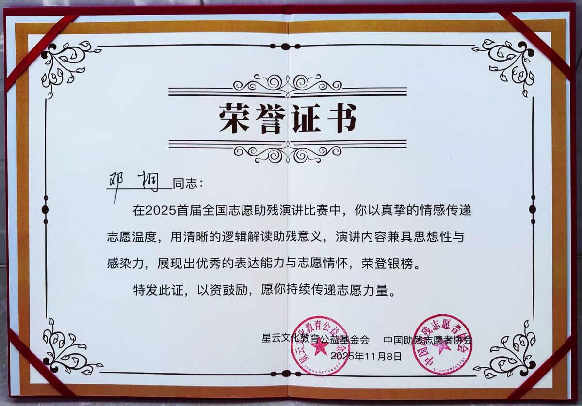 11月8日,由中國助殘誌願者協會與星雲文化教育公益基金會聯合主辦的2025首屆全國誌願助殘演講比賽決賽在北京市規劃展覽館多功能廳隆重舉行,梵客集團社會事業部經理鄧桐斬獲殊榮。