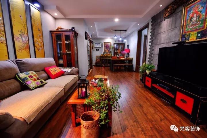 ∆ 電視背景牆上的唐卡是客戶多年前去西藏朋友贈送的,裝飾木質雕花是有些年頭的老舊物件,在高碑店古典家具一條街淘來的。