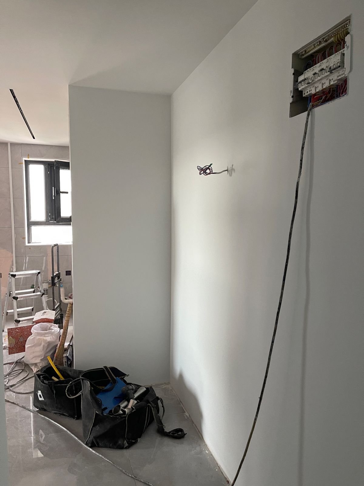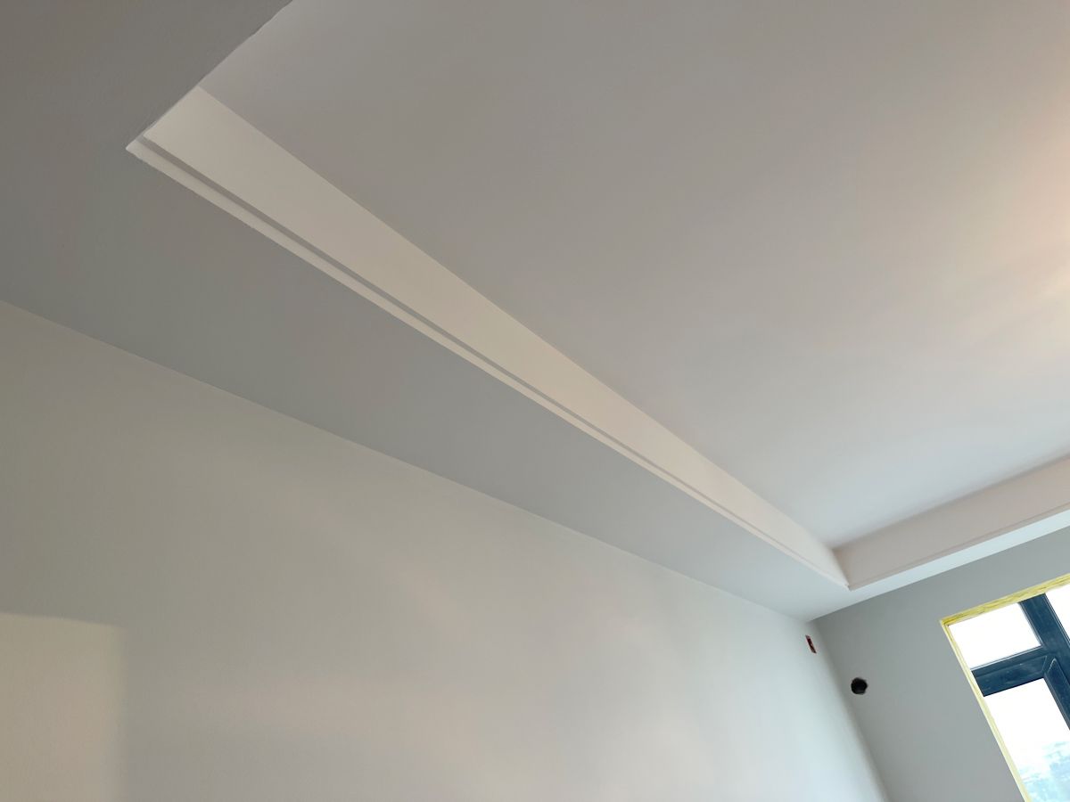因為有貼牆的櫃子,暫時未安裝踢腳線,同時為了配合櫃子安裝,保證櫃體與牆麵緊密貼合、無縫隙,櫃子從上到下嚴絲合縫,因此此處牆麵做了垂平工藝。