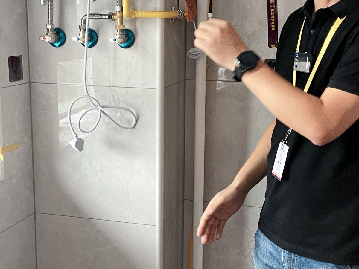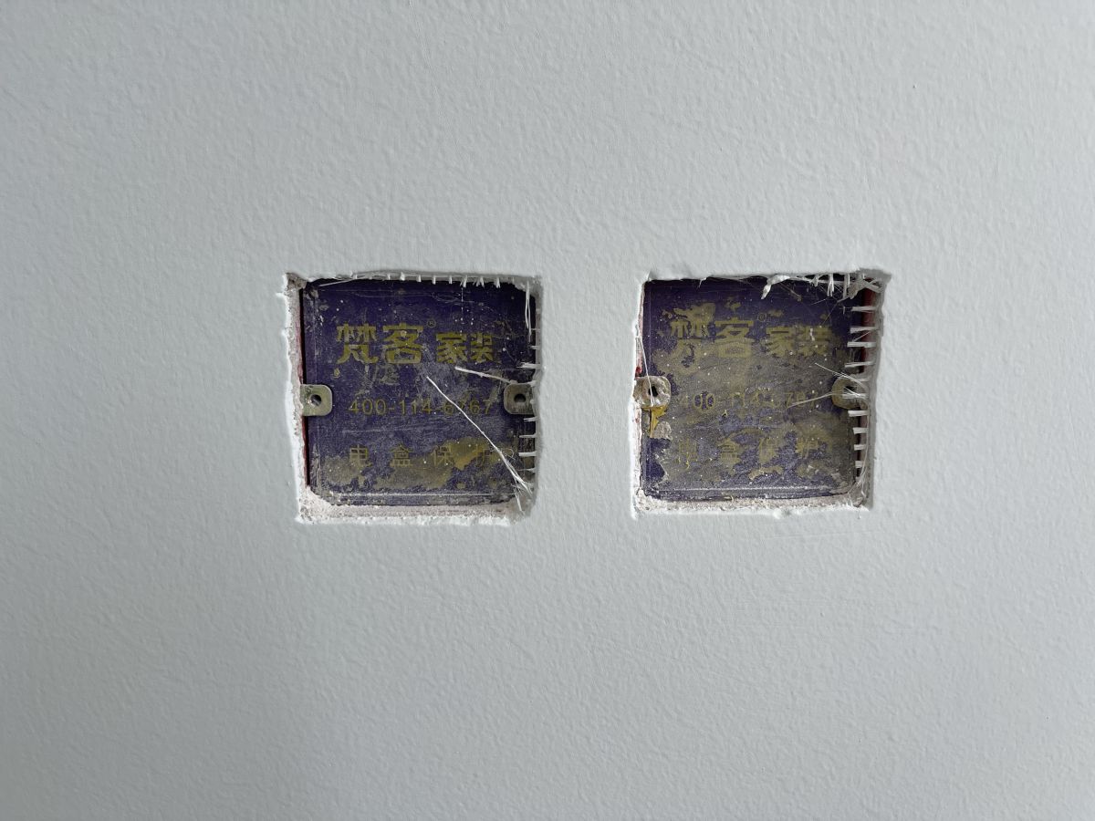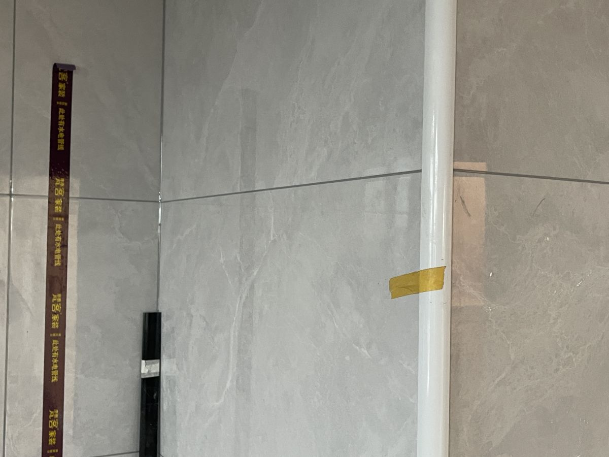 ↓ 牆麵貼著水電標識貼,警示牆內是水電管線,避免後期安裝櫥櫃、打眼、開孔時出現安全隱患。