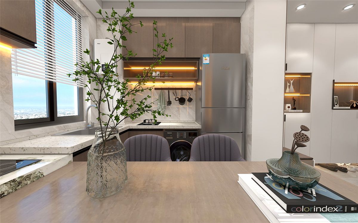 業主沒有太多複雜的烹飪需求,設計師設計了一個西式廚房,從灶台→吧台→書桌一氣嗬成,整體又時尚,增加了功能區,提升了空間利用率。