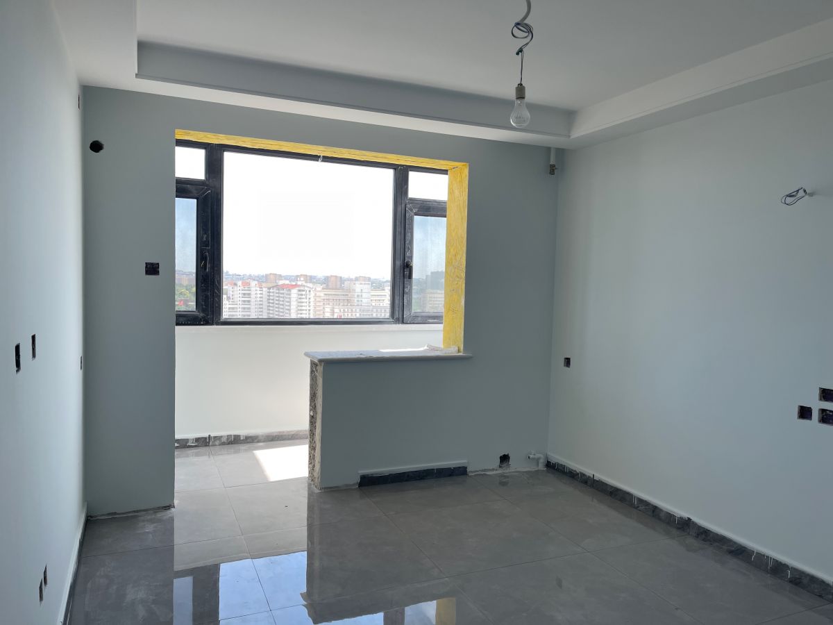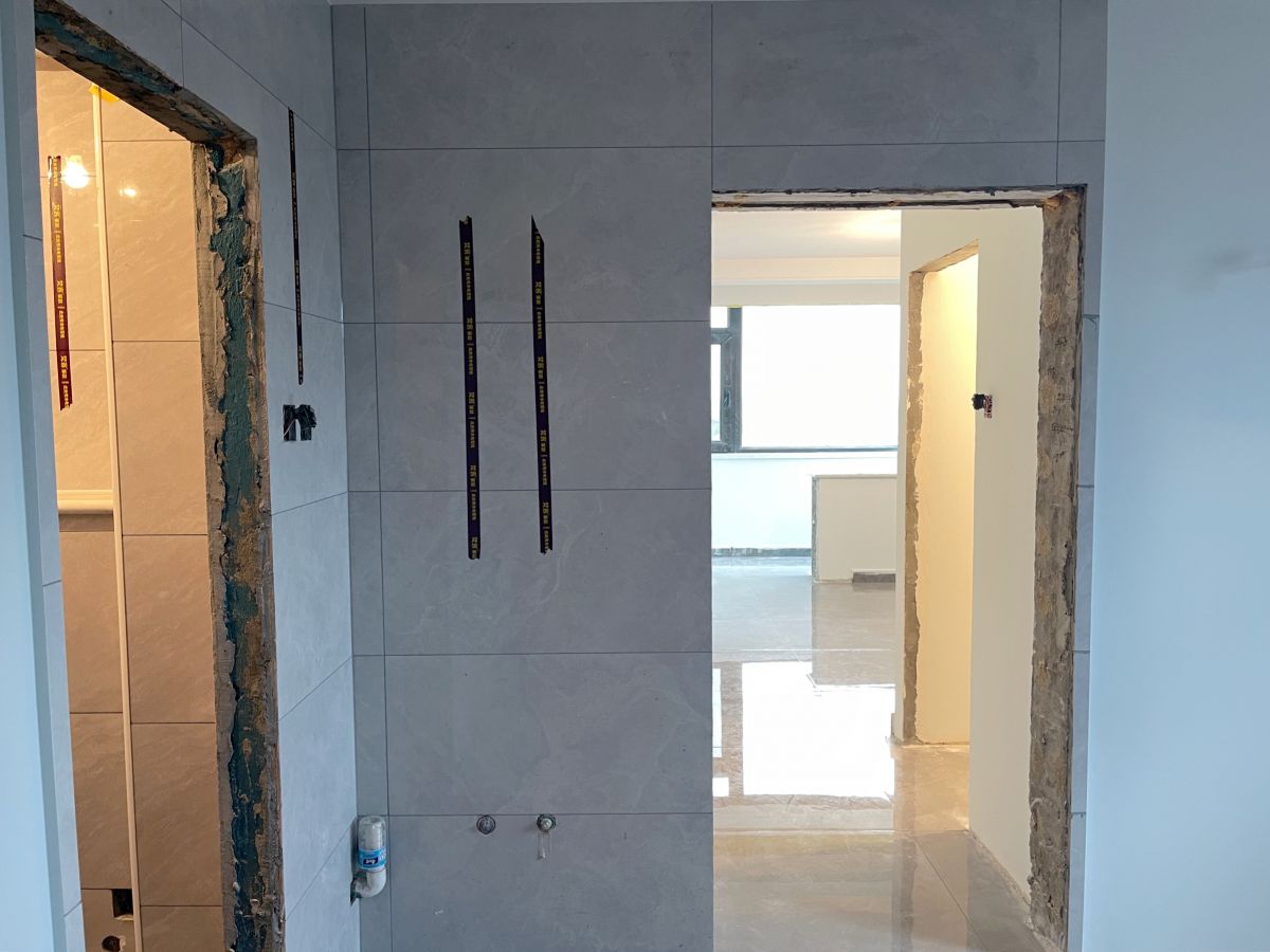 ↑ 廚房灶台區,幹淨整潔。牆麵采用400*800的瓷磚鋪貼,時尚大氣,工藝嚴絲合縫。目前在等櫥櫃進場,陸續還會有木門、潔具、燈具等進場安裝。
