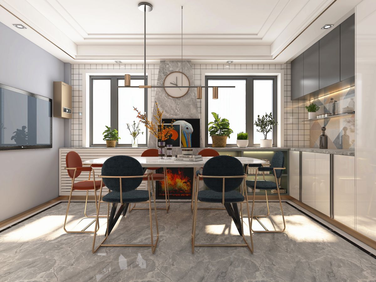 石材被廣泛運用在整個空間,由地板蔓延至牆麵,營造出高貴、大方的氛圍。為了美化暖氣管道,專門設計了一個裝飾壁爐,大理石裝飾,成為餐廳一景。
