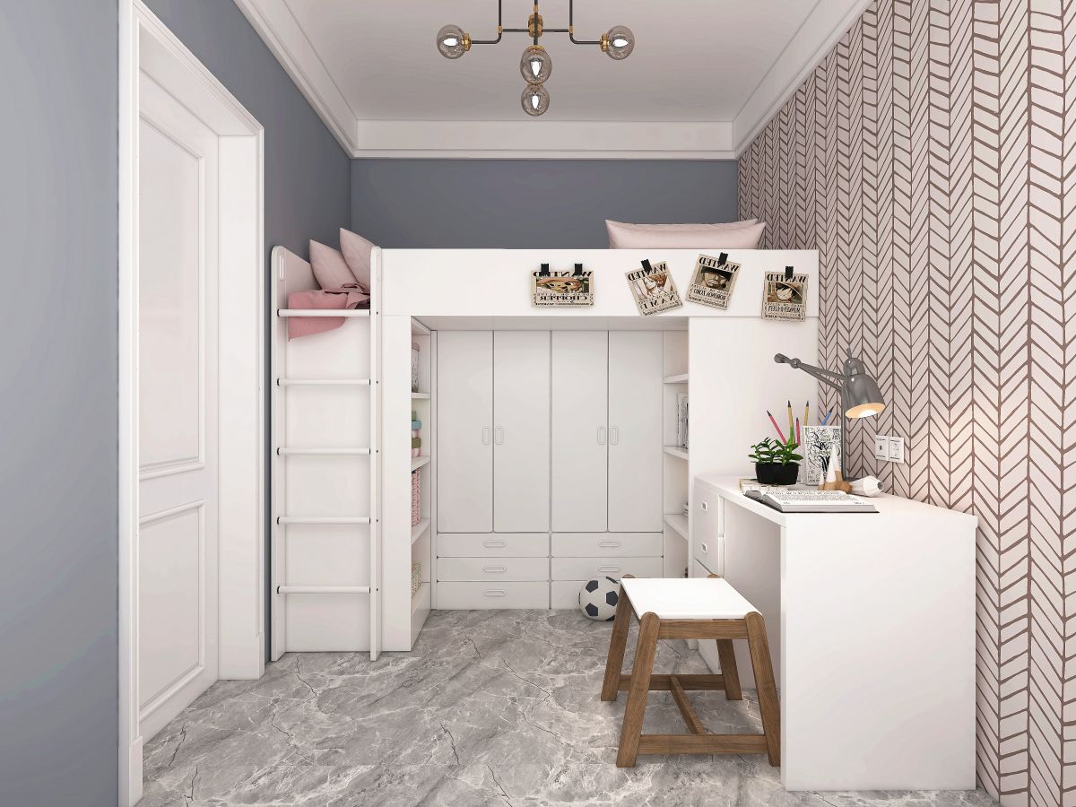 將衣櫃、書架與床合三為一,床的下方是衣櫃和書架,非常節約空間,適合小戶型,而且還預留出更多的地麵空間,方便小朋友玩耍。