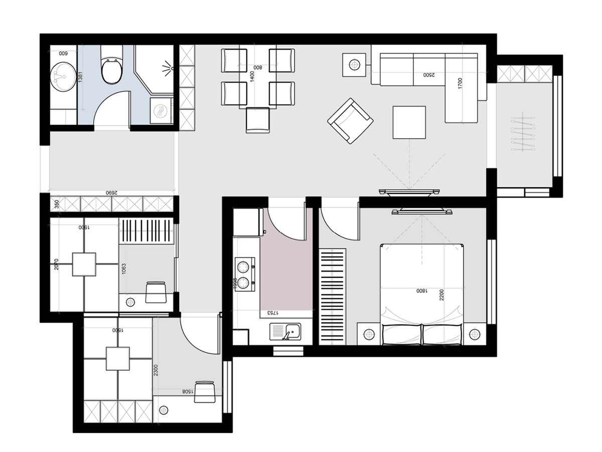 該案原始戶型是一個兩居室 ,duiyukongjiandexuqiushouxianmanzudeshikehusandairenwuhaozhijiadejuzhuxuqiu。haizinanhaixianzaishangxiaoqu,fumuouerhuilaizhu,danwoshibixuyaoduli。zaijuzhuxiguanshangnvzhurenxihuanganjingjianjiedehuisexi,tongguogoutongzuizhongquedingzuoxiandaiqingshe。weilemanzuxuqiuzaiyuanyouliangjushidejichushangguihualesanjushi。weishengjianyetongshigaiweiganshisanshifenli。weiletuchukongjiantexing,zaizhengtisetiaoshangbaochiheibaihuidezhutiao,jiarunuansedenglaitiaojiekongjianfenwei。zaigaolengdekongjianzhongyoubushirouhedeyimian。
