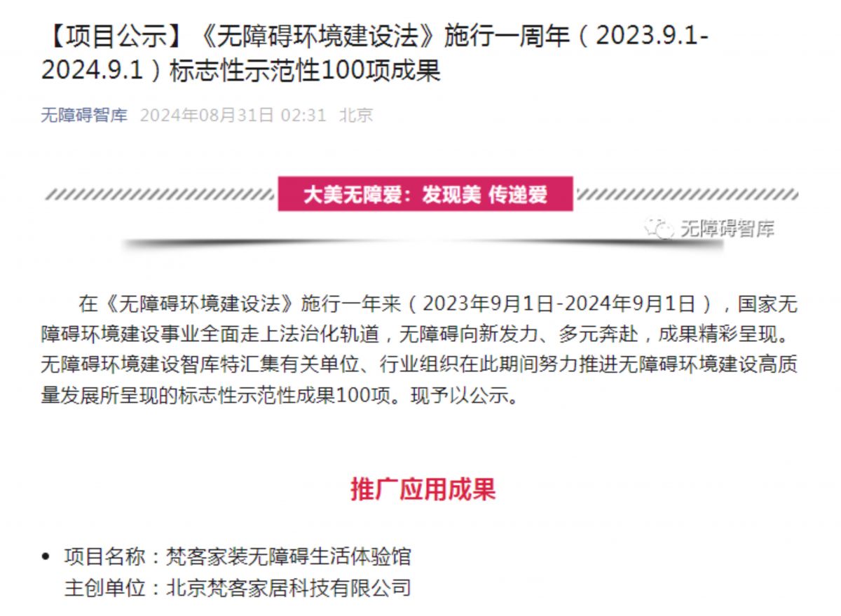 在《無障礙環境建設法》施行一年來(2023年9月1日-2024年9月1日),國家無障礙環境建設事業全麵走上法治化軌道,無障礙向新發力、多元奔赴,成果精彩呈現。無障礙環境建設智庫特彙集有關單位、行業組織在此期間努力推進無障礙環境建設高質量發展所呈現的標誌性示範性成果100項,“梵客家裝無障礙生活體驗館”上榜“推廣應用成果”。