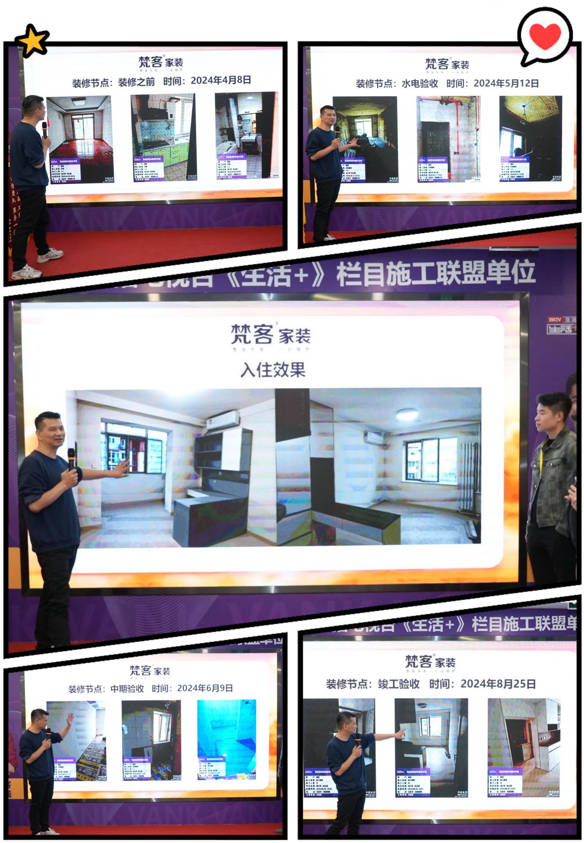 活動現場,秦天老師還為大家播放並講解了施工全過程,從裝修前到水電驗收、中期驗收、竣工驗收直至最後入住,讓現場的業主朋友對梵客的裝修流程、施工工藝、套餐選擇等有了更明確的認識。