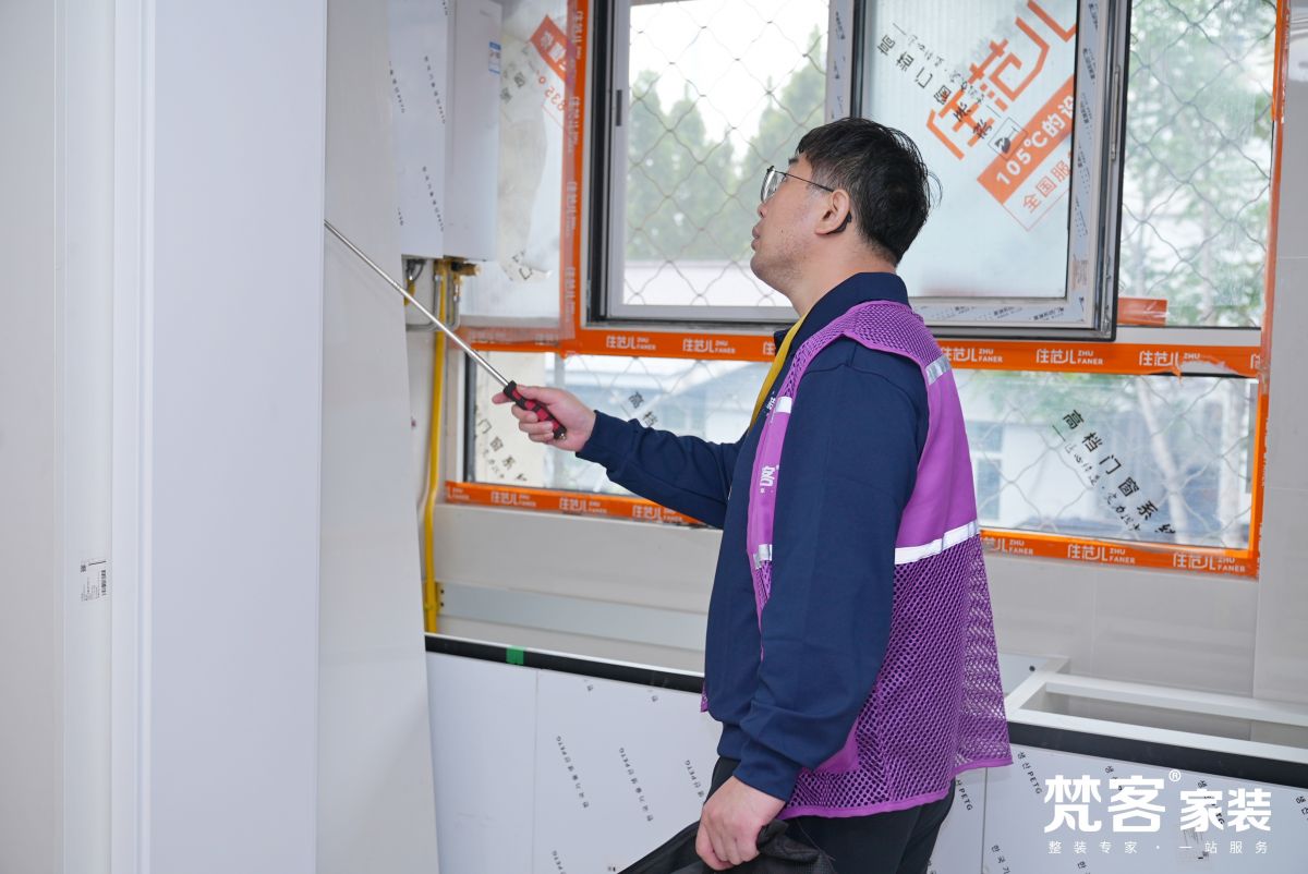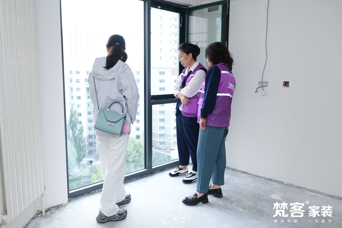 梵客集團副總裁、梵客家裝總經理任琳巡視了每個房間,並勘察牆麵、門套、五金等各處,每個細節都不放過,要求盡善盡美。