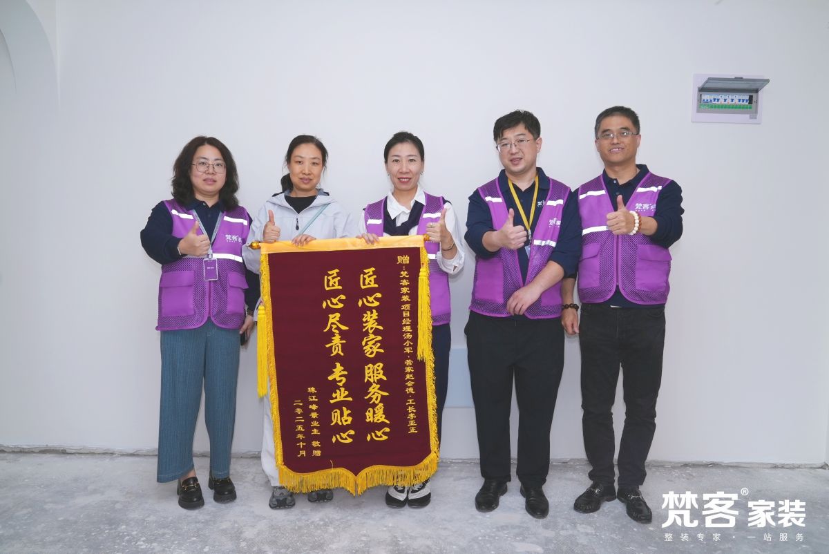 第二家工地依然處於施工階段,業主同樣也帶來錦旗。“匠心盡責”是對梵客最大的褒獎。梵客家裝成立18年,已為數萬名業主提供了滿意的裝修服務,每次接到錦旗,看到業主滿意的笑容、聽到發自內心的讚譽之詞,都會深感責任重大,更堅定了要夯實服務、做好產品的信念。