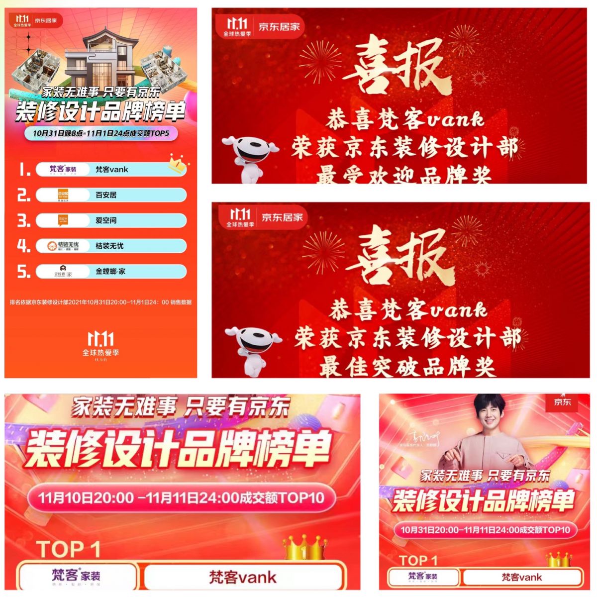 在去年京東11.11全球熱愛季,梵客家裝更是殊榮卓著,穩拿首日開門紅熱賣榜,11.1-11.11期間熱賣榜,11.11全天熱賣榜三個NO.1;喜獲京東裝修設計部最受歡迎品牌獎和最佳突圍品牌獎兩大獎項;登頂京東裝修設計品牌榜單,並實現在京城業績連年翻倍增長!此外,梵客家裝還與眾多大牌同時榮登品牌龍虎榜單TOP10,成為家裝行業唯一上榜品牌。