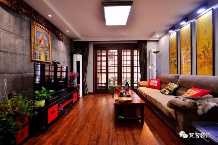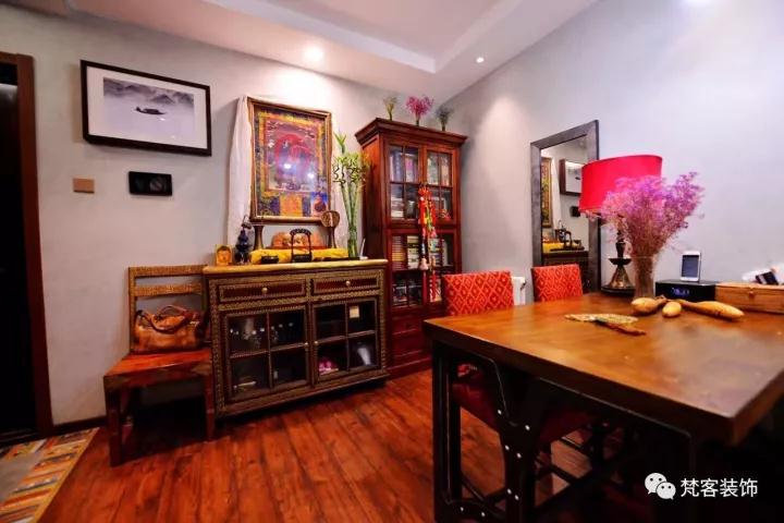 客廳古香古色,無論是色調的搭配還是材質的選用,甚至包括家具的選擇,都為這個空間增添複古的韻味。而各種裝飾畫、小擺件,也是點睛之筆,用的恰到好處。