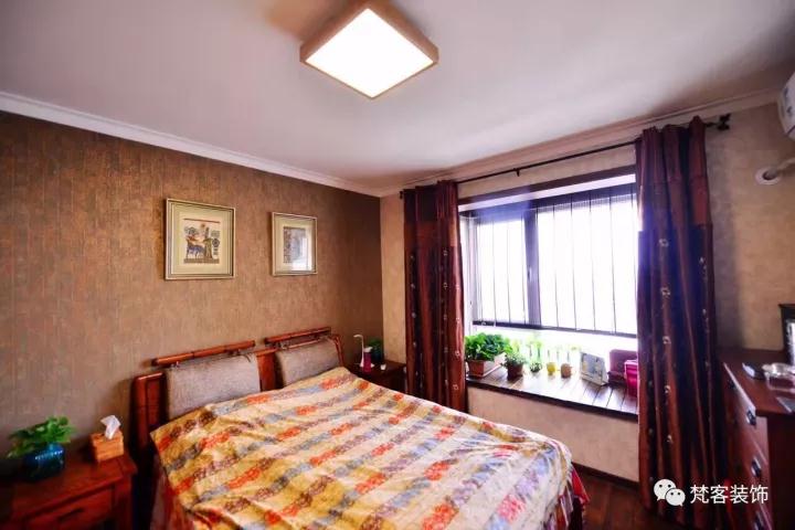 和客廳相比,臥室更顯溫馨寧謐,溫潤的色調讓這個空間充滿安寧。簡約複古的家具,防腐木飾麵的飄窗,都給主人帶來家的祥和。