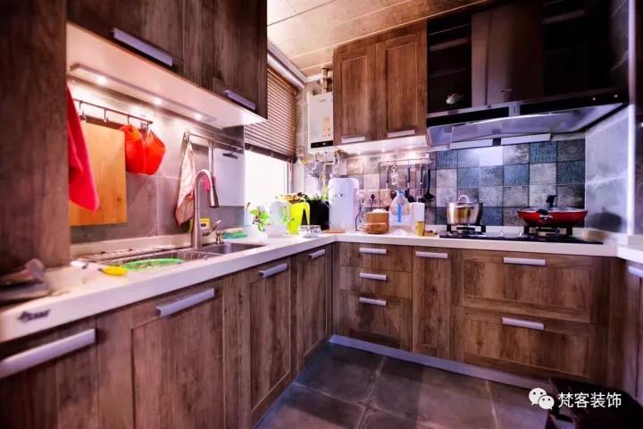 廚房具有得天獨厚的采光優勢,可以考慮用深色係打造整個空間,延續複古風格。以原木紋理的櫥櫃搭配灰色牆磚、甲骨文花片,整個空間就是現代與古典的交融。