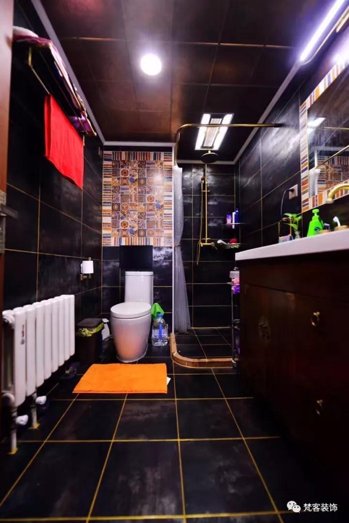 和廚房的複古相比,洗手間的風格相對現代。大膽運用金屬感的牆地磚,搭配銅色衛浴五金,使這個空間充滿不羈的韻律。馬桶後方用花片做背景牆、鏡麵邊框以花片裝飾,這和整個空間藏文化理念相吻合。