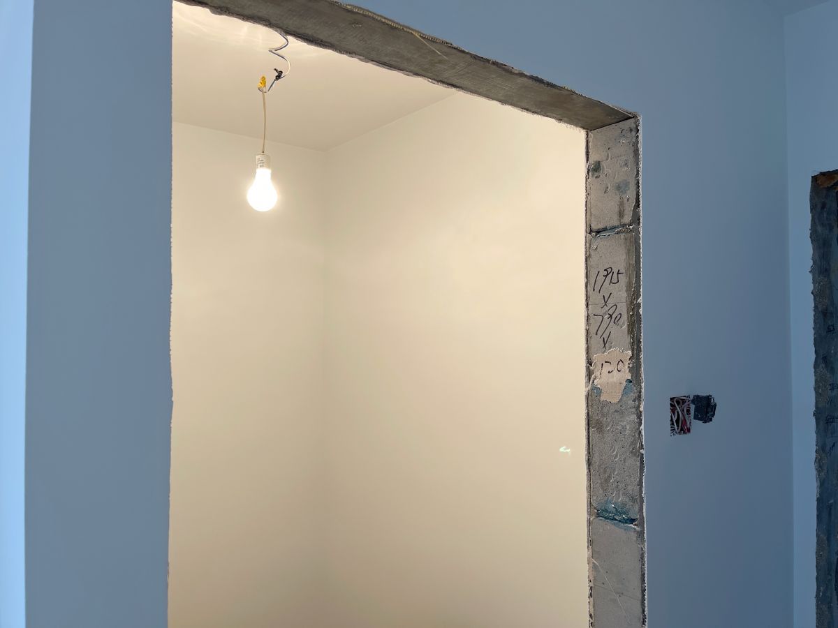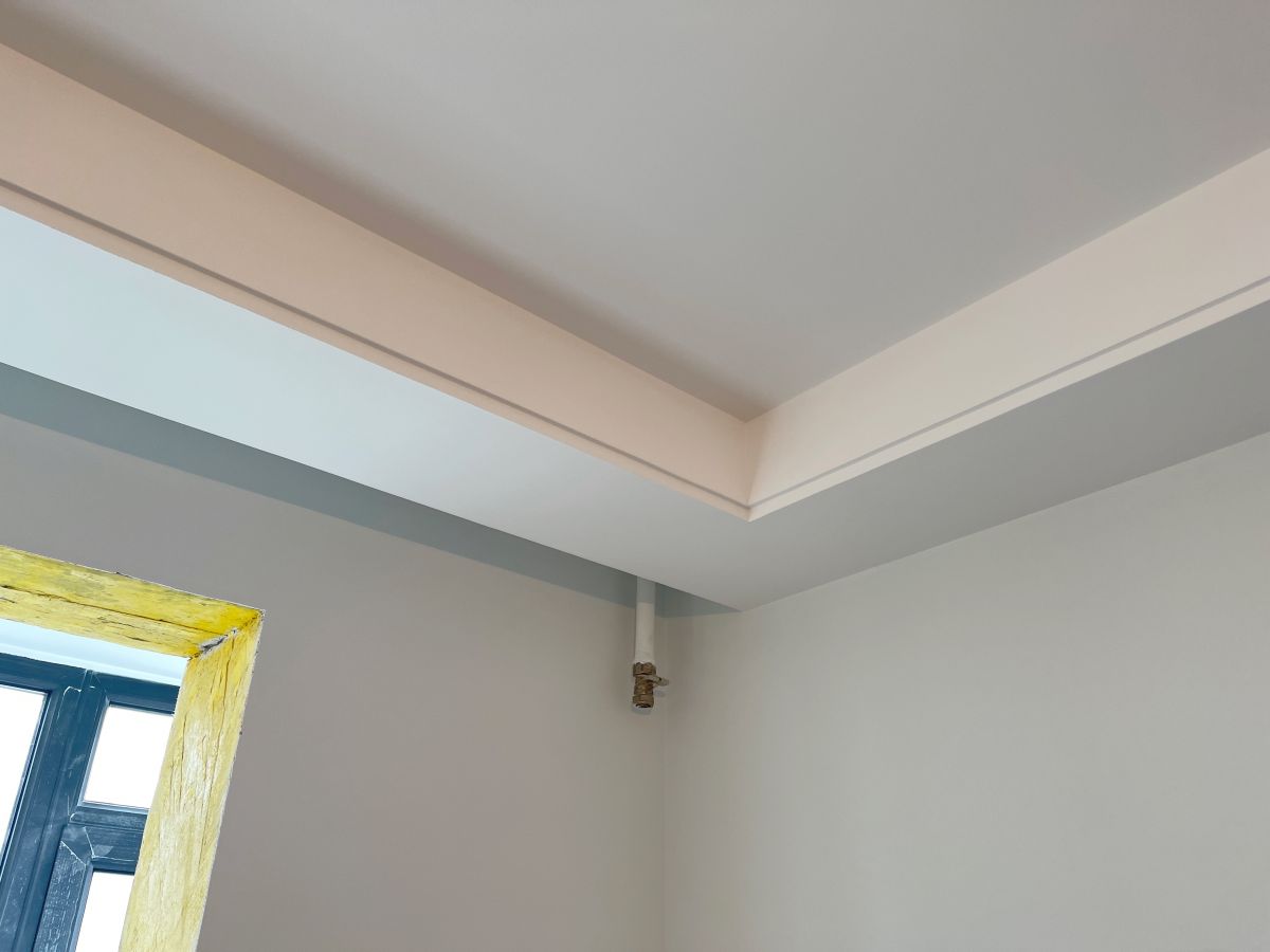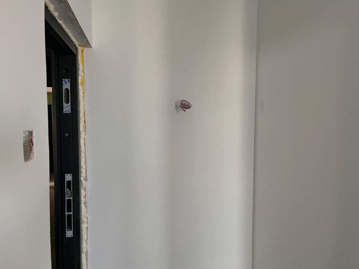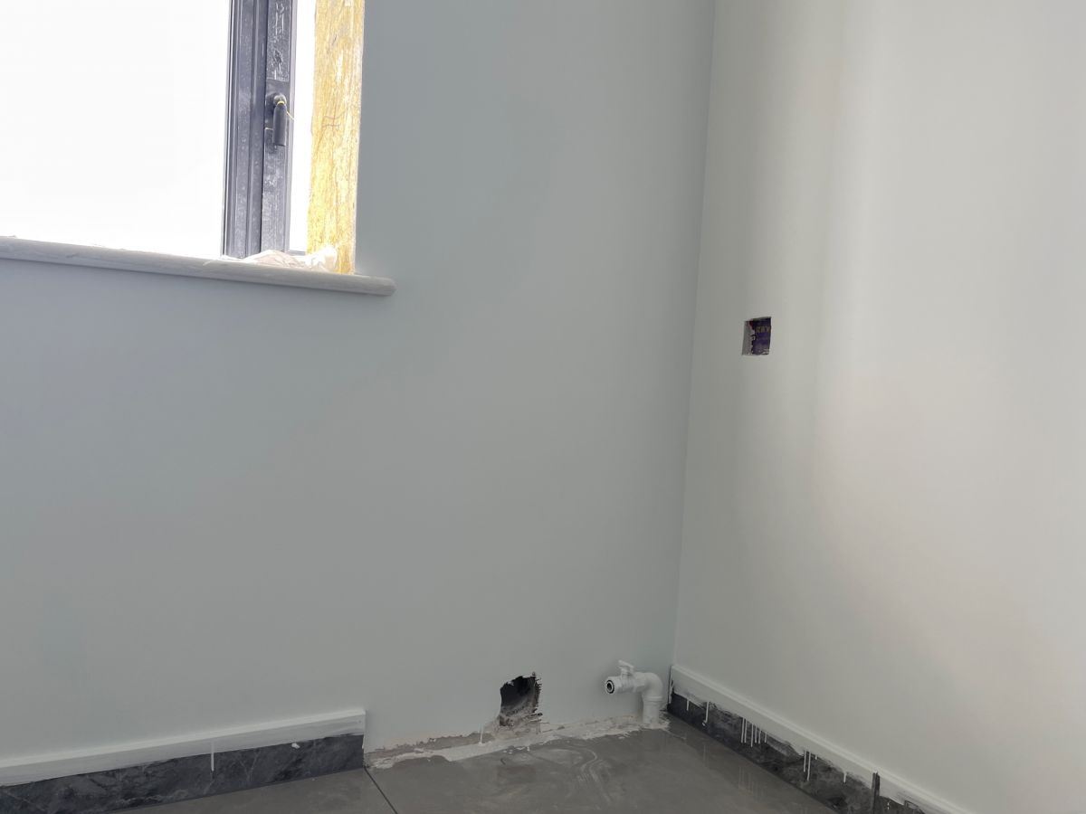 因為有貼牆的櫃子,暫時未安裝踢腳線,同時為了配合櫃子安裝,保證櫃體與牆麵緊密貼合、無縫隙,櫃子從上到下嚴絲合縫,因此此處牆麵做了垂平工藝。
