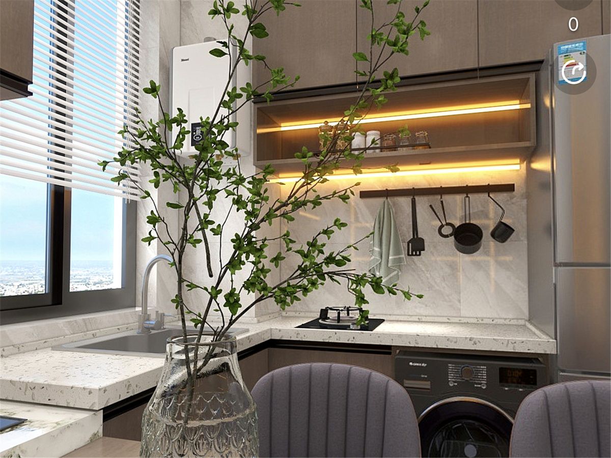 業主沒有太多複雜的烹飪需求,設計師設計了一個西式廚房,從灶台→吧台→書桌一氣嗬成,整體又時尚,增加了功能區,提升了空間利用率。