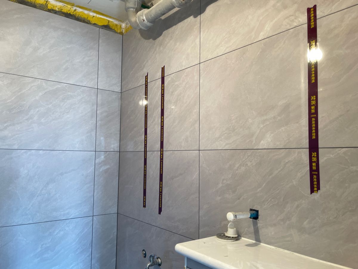 ↓ 牆麵貼著水電標識貼,警示牆內是水電管線,避免後期安裝櫥櫃、打眼、開孔時出現安全隱患。