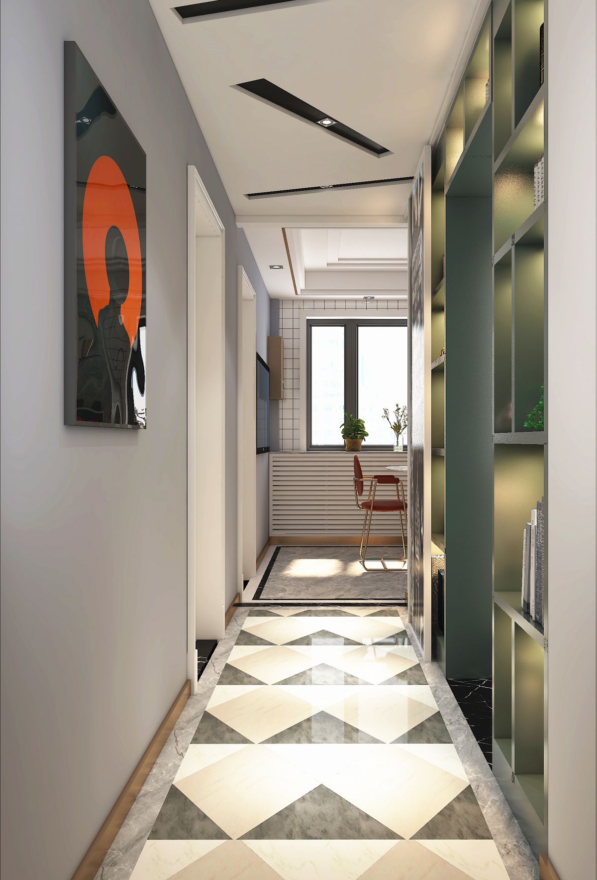 廊(lang)廳(ting)采(cai)光(guang)不(bu)佳(jia),書(shu)櫃(gui)內(nei)設(she)燈(deng)光(guang)照(zhao)明(ming),不(bu)僅(jin)讓(rang)這(zhe)個(ge)小(xiao)區(qu)域(yu)光(guang)彩(cai)奪(duo)目(mu),也(ye)方(fang)便(bian)平(ping)日(ri)拿(na)取(qu)書(shu)籍(ji)。幾(ji)何(he)圖(tu)形(xing)的(de)地(di)磚(zhuan)時(shi)尚(shang)又(you)閃(shan)亮(liang),現(xian)代(dai)輕(qing)奢(she)風(feng)若(ruo)影(ying)若(ruo)現(xian),反(fan)射(she)出(chu)的(de)光(guang)源(yuan)也(ye)為(wei)空(kong)間(jian)增(zeng)加(jia)了(le)一(yi)絲(si)亮(liang)度(du)。